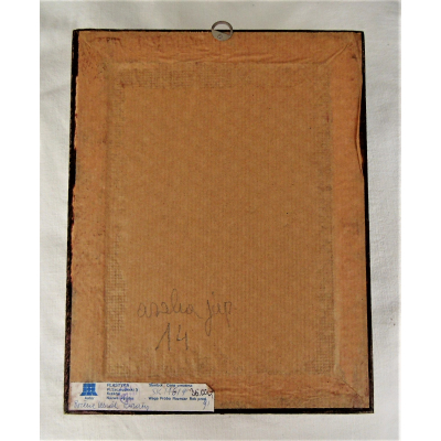 Miniatura olejna na tekturze w brązowej drewnianej ramie, sygnowana "BL91"